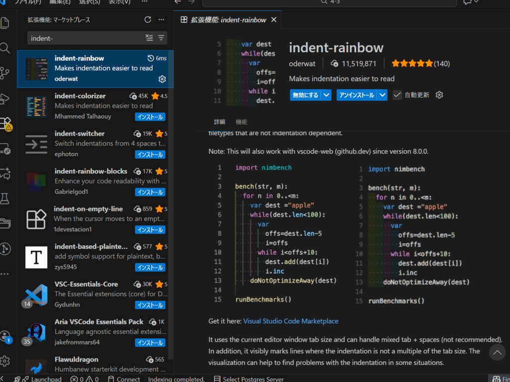 すると検索欄が出るので、「indent-rainbow」と入力してインストールしましょう。