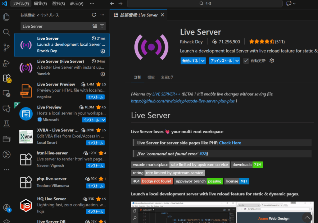 上記と同様に拡張機能で、「Live Server」を検索してインストールしましょう。