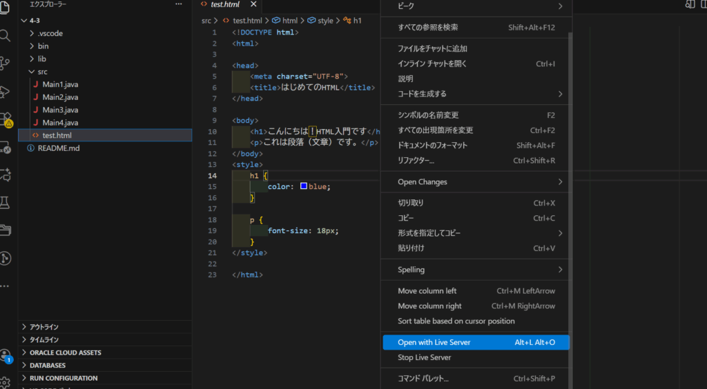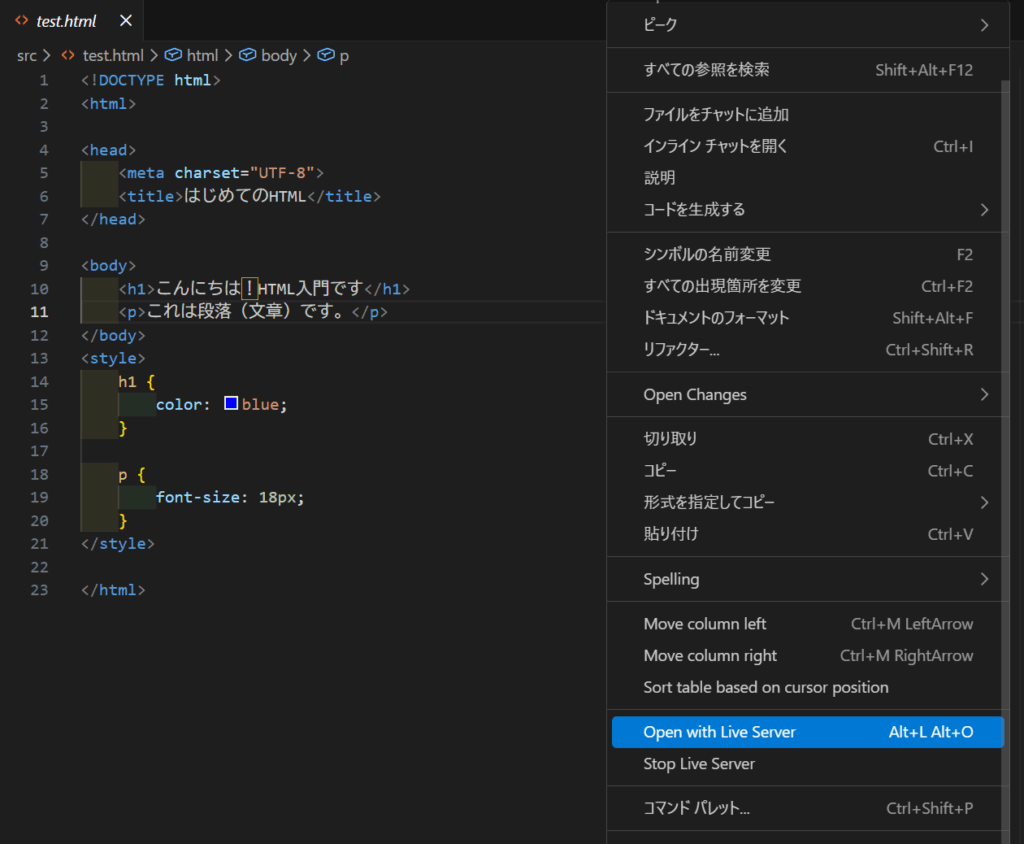 インストール後(反映されない場合はVSCodeを再起動)、自分が作った「test.html」などのファイルをVSCodeで開きます!