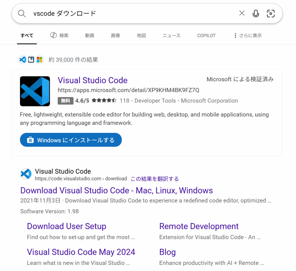 以上のような感じで検索すると色々vscodeをインストールできるサイトが見つかると思います。