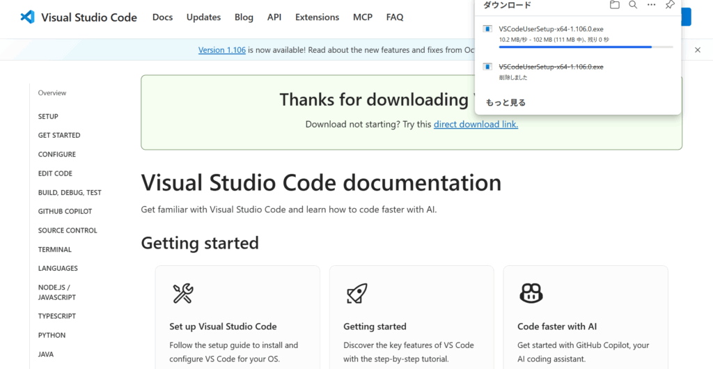 表示が確認できれば、右上にあるVSCodeなんちゃらかんちゃら1060.0.exeをクリック。表記が違う方もいる?その際は自分で調べてみましょう!
