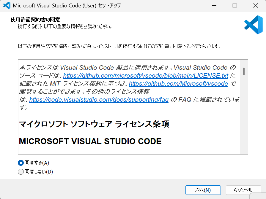 「同意する」を選択して、「次へ」をクリックしましょう。