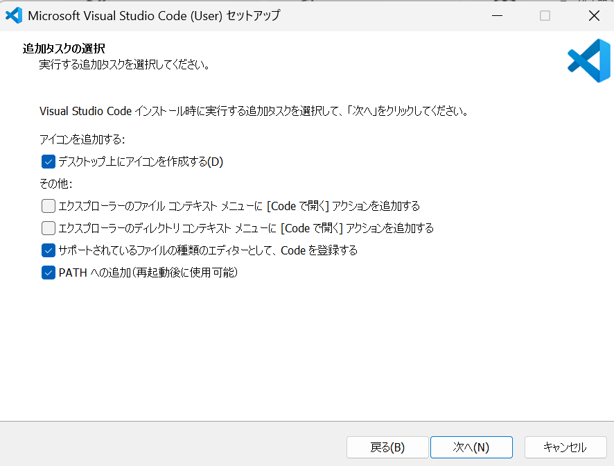 次に進むとこの画面に映ります。ここでは1番上のチェックボックス「デスクトップ上にアイコンを作成する」をチェックしましょう。あとで使いやすいので。